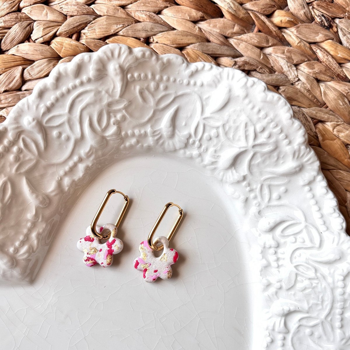 Dolce Fiore ist eine kleine Hommage an die schönen, leisen Momente. Die ovalen, vergoldeten Creolen tragen zarte, handgefertigte Blütenanhänger in warmen Rosa- und Rottönen – weich, feminin und voller Ausdruck. Die Farben wirken lebendig und erinnern an Blüten im Abendlicht – sanft und gleichzeitig intensiv.