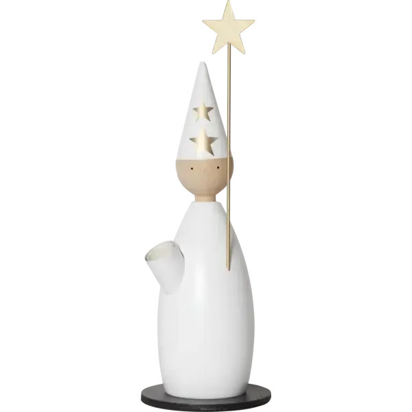 Dieser liebevoll gedrechselte Sternenjunge ist ein Highlight für jede Winter- und Weihnachtsdekoration. Mit seinem klaren, nordischen Design, dem goldenen Sternstab und der schlichten weißen Silhouette bringt er ruhige, warme Feststimmung in dein Zuhause.
