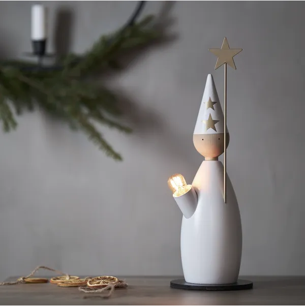 Die Figur ist aus Holz gefertigt und mit einer E14-Fassung ausgestattet – ideal für kleine LED- oder Filament-Leuchtmittel. Ob im Fenster, auf dem Sideboard, im Regal oder als Teil eines weihnachtlichen Arrangements: Der Sternenjunge setzt ein sanftes Licht und verleiht jedem Raum eine stimmungsvolle, skandinavische Note.