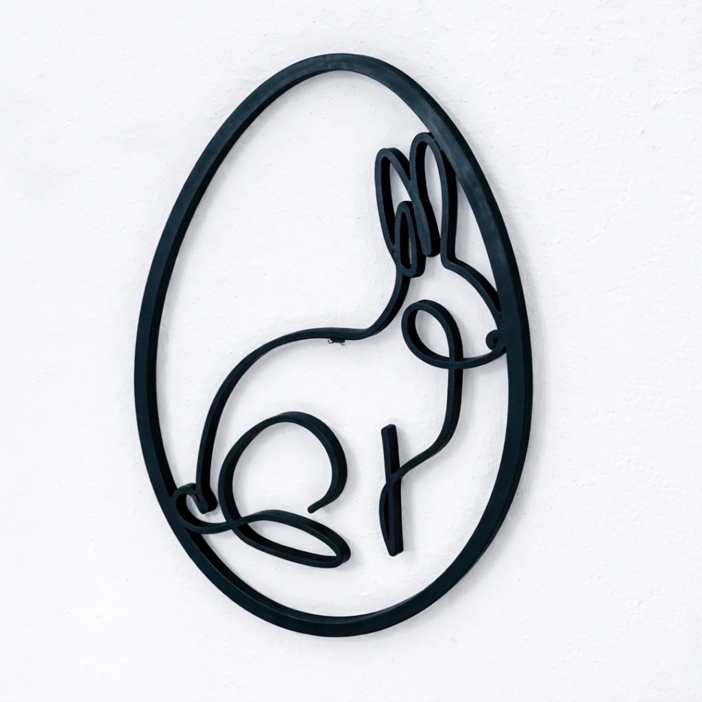Dieses filigrane Dekoelement aus MDF zeigt einen Hasen im Ei in reduzierter Linienoptik. Die schlichte Gestaltung wirkt modern und gleichzeitig zeitlos — perfekt für eine natürliche Osterdekoration ohne Kitsch.