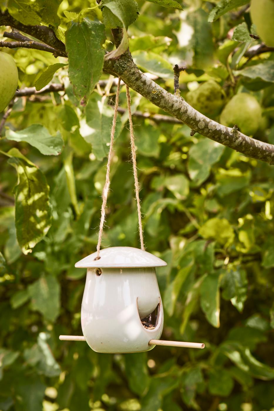 im stilvollen Keramikdesign mit Sitzstange. Ideal für kleine Gartenvögel – eine dekorative und funktionale Lösung für den Futterplatz im Freien. Einfach aufzuhängen mit Naturschnur.