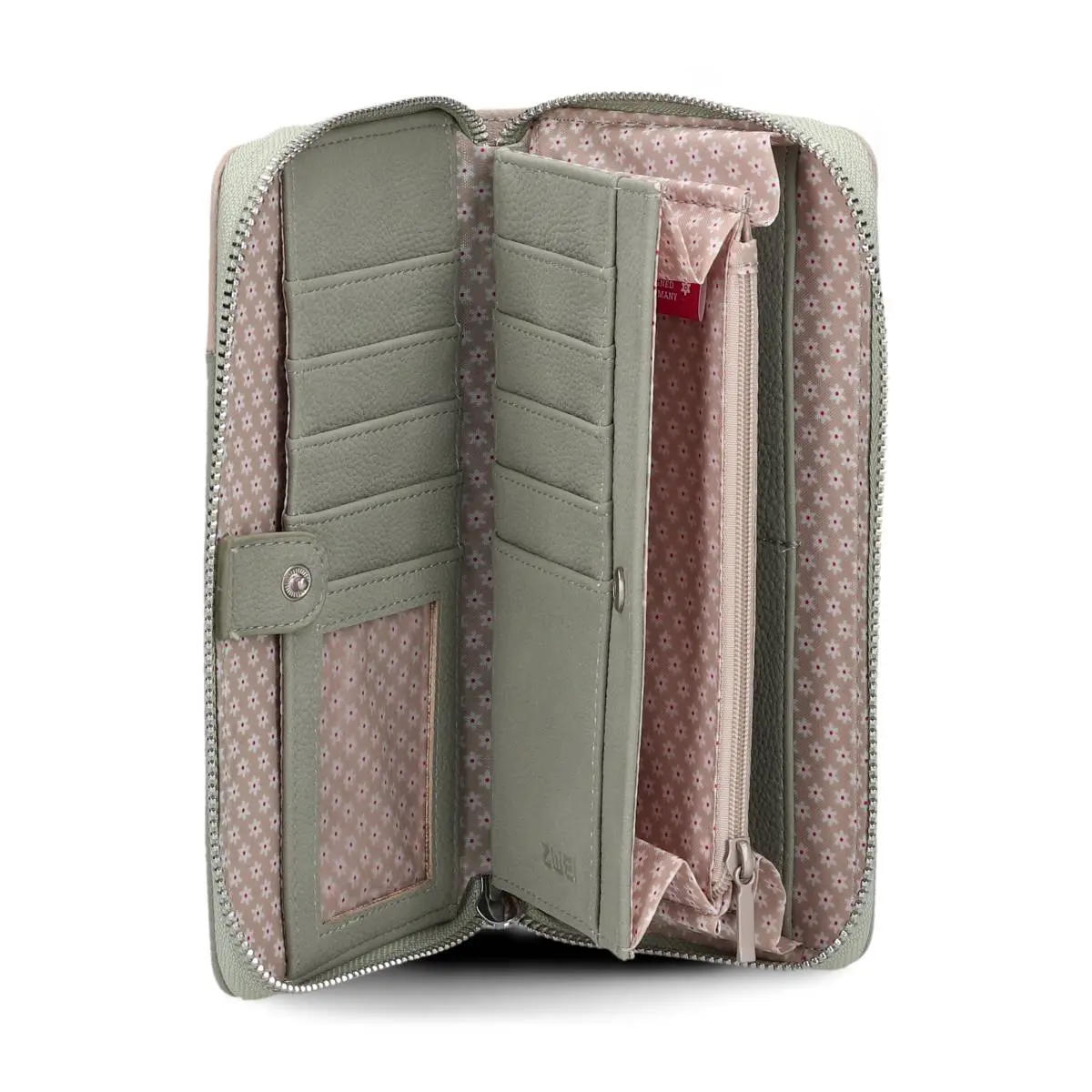 in der Farbe Sage ist eine große Damenbörse für alle, die gerne Ordnung im Portemonnaie haben und dabei nicht auf ein stilvolles Design verzichten möchten.